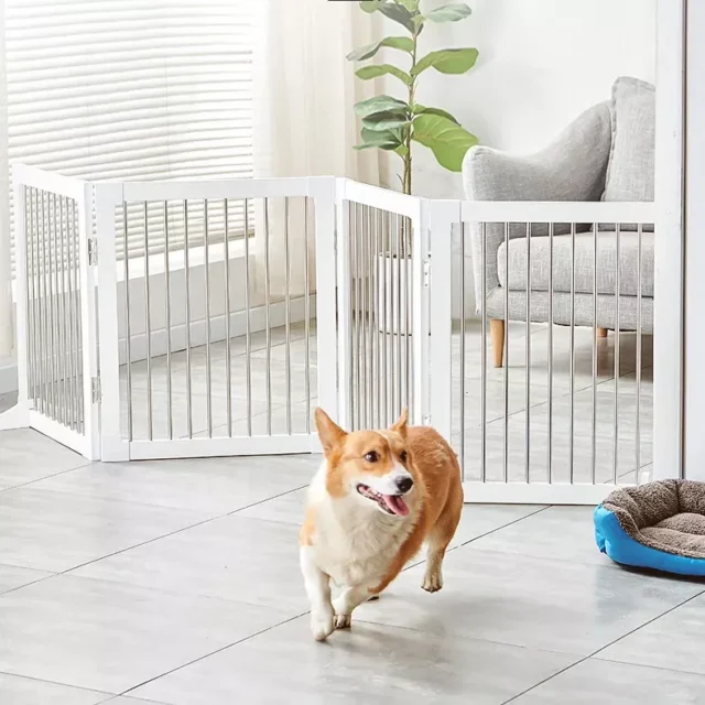 This pet gate is ideal for indoor use, whether you’re looking to create a puppy pen, restrict access to certain rooms, or simply keep your pets safely away from hazards. Its versatility makes it suitable for doorways, hallways, and other entry points, ensuring your pets have the freedom they need while keeping them out of trouble.