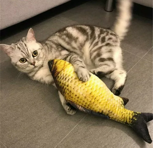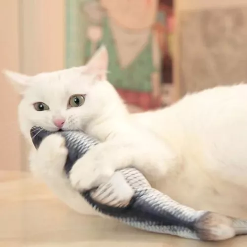 Actually my timid tuxedo cat was wary of the fish…flopping or still. So I gave it to a friend for her gregarious Maine Coon. She loved it! As she’s a big girl – 17lbs. – the fish is perfect for grabbing. The flopping was an added delight. Then the dog got interested. Tip: so your cat doesn’t tire of the fish, allow a limited playtime, then put it away for another time. Then it’s always new. Overall a quality product.