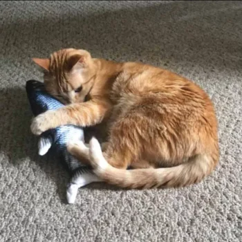 Since opening this toy, my cat has refused to put it down. He has spent literal hours just carrying it everywhere with him and watching it until the battery finally died and he lost interest. Luckily, the fish has a rechargeable battery so I just plugged the fish in overnight and it was as good as new in the morning. He likes to carry the fish everywhere with him, it even came bird watching on the windowsill with him. The motor to the fish isn’t loud but it isn’t silent either, the fish has an on/off switch so I make sure to turn it off at night time while it’s recharging so that I’m not woken up by a stuffed fish flapping on my face. Definitely a fun toy for cats and it comes highly recommended by my cat.