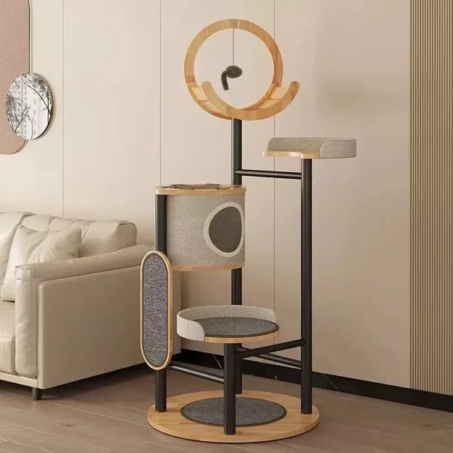 Our cat climbing tower is more than just a piece of pet furniture; it’s a haven for your cat. The solid wood construction ensures stability and safety while your cat jumps and plays. The integrated scratching board not only protects your furniture but also keeps your cat’s claws healthy and strong. With its 5-layer design, your cat will have plenty of space to explore, play, and rest.