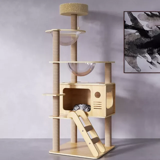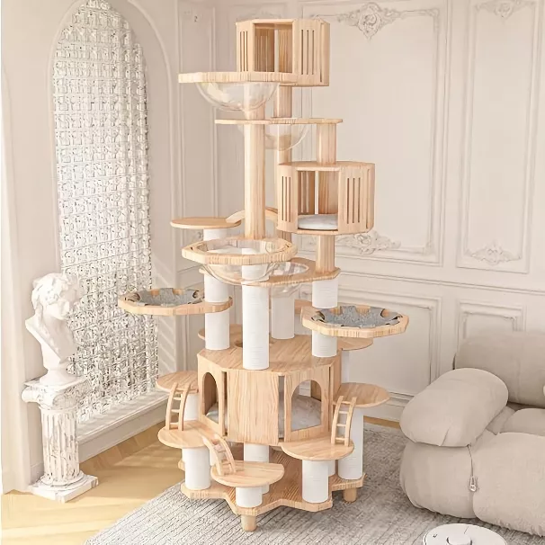 Our cat climbing frame is more than just a piece of pet furniture; it’s a comprehensive playhouse designed with your cat’s happiness in mind. The five layers and above structure offer ample space for climbing, scratching, and lounging. From the majestic Rainbow Bridge to the solid wood construction, every detail is crafted for durability and appeal. Shipped conveniently via rail and sea, this cat tree arrives ready to enchant your pet.