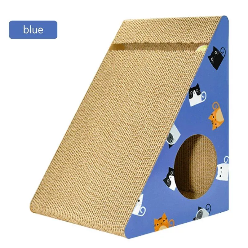 Crafted from high-quality, abrasion-resistant corrugated paper, this scratcher promises durability and long-term use. Its unique triangular shape allows for easy wall attachment, saving valuable floor space in your home. The scratcher is enhanced with holes and a bell, catering to your cat’s natural instincts for scratching, climbing, playing, and resting. In striking blue and yellow colors, it’s not just a toy, but a stylish addition to any room.